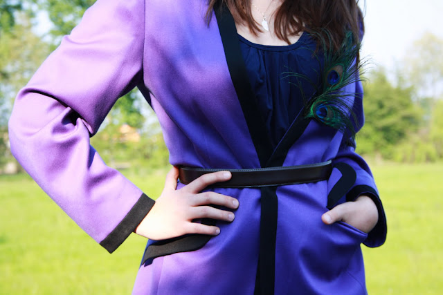 Quest'outfit è meraviglioso. Ti faccio i miei complimenti.Adoro la piuma di Pavone sul colore del viola...accostamento cromatico divino.